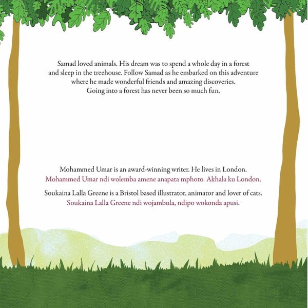 Samad loved animals. His dream was to spend a whole day in a forest and sleep in the treehouse. Follow Samad as he embarked on this adventure where he made wonderful friends and amazing discoveries. Going into a forest has never been so much fun. A bilingual edition of this book is available in the following languages: Acholi, Afar, Afrikaans Akwapim, Amharic, Arabic, Aramaic, Asante, Bandi, Bassa, Bemba, Burmese, Chichewa, Chinese, Chinyanja, Chokwe, Coptic, Dan, Dinka, Edo, Efik, Ekugesii, Emakwa, Fante, Finniah, Fon, Fulfulde, Ga, Gikuyu, Gola, Grebo, Gurage, Hadiyyasa, Harrari, Hausa, Ibibio, Igbo, Ijaw, Itsekiri, Kalabari, Kalanga, Kalenjin, Kamba, Kambaata, Kanembu, Kanuri, Khmer, Kiembu, Kikongo, Kimbundu, Kimeru, Kinyarwanda, Kirundi, Konso, Korean, Kpelle, Kru, Kunama, Kurdish, Lao, Lingala, Lomwe, Lorma, Luganda, Lubukusu, Luo, Maasai, Maan, Mandinka, Maninka, Mende, Ndebele, Mauritian Creole, Mongolian, Nobiin, Nuer, Nupe, Oromo, Pidgin, Sango, Portuguese, Runyoro-Rutooro, Shona, Sesotho, Sidama, Sepedi, Somali, Somali Osmanya, Setswana, Siswati, Soninke, Swahili, Swedish, Tagalog, Temne, Tigre, Tigrinya, Tumbuka, Tshiluba, Tshivenda, Turkish, Umbundu, Vai, Wolayita, Wolof, Xhosa, Xitsonga, Yao, Yoruba, Zarma, Zulu.