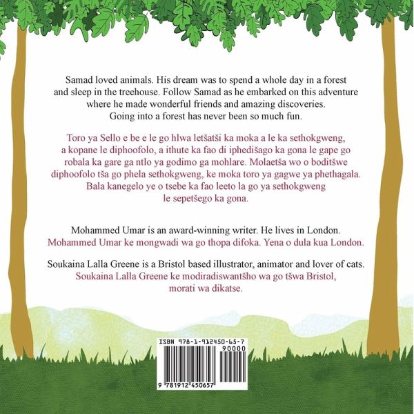 Samad loved animals. His dream was to spend a whole day in a forest and sleep in the treehouse. Follow Samad as he embarked on this adventure where he made wonderful friends and amazing discoveries. Going into a forest has never been so much fun. A bilingual edition of this book is available in the following languages: Acholi, Afrikaans Akwapim, Amharic, Asante, Bemba, Chichewa, Chinyanja, Ewe, Fante, Fulfulde, Ga, Gikuyu, Hausa, Igbo, Kalenjin, Kinyarwanda, Kirundi, Luganda, Luo, Ndebele, Oromo, Shona, Sepedi, Sesotho, Somali, Setswana, Swahili, Tigrinya, Xhosa, Yoruba, Zulu.