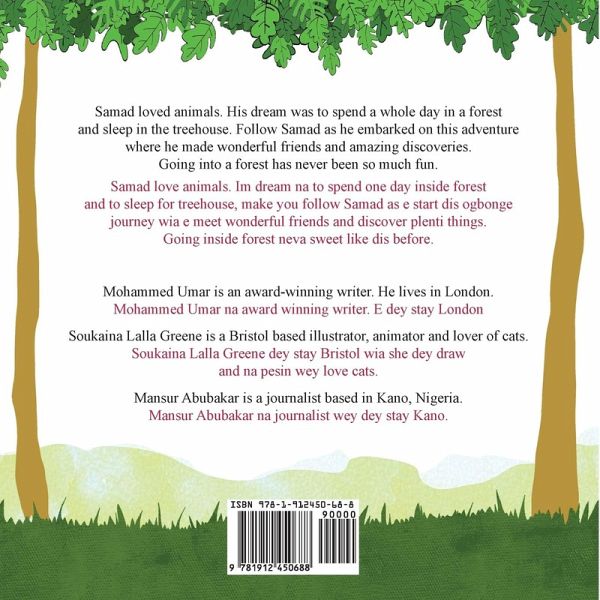 Samad loved animals. His dream was to spend a whole day in a forest and sleep in the treehouse. Follow Samad as he embarked on this adventure where he made wonderful friends and amazing discoveries. Going into a forest has never been so much fun. A bilingual edition of this book is available in the following languages: Acholi, Afar, Afrikaans Akwapim, Amharic, Arabic, Aramaic, Asante, Bandi, Bassa, Bemba, Burmese, Chichewa, Chinese, Chinyanja, Chokwe, Coptic, Dan, Dinka, Edo, Efik, Ekugesii, Emakwa, Fante, Finniah, Fon, Fulfulde, Ga, Gikuyu, Gola, Grebo, Gurage, Hadiyyasa, Harrari, Hausa, Ibibio, Igbo, Ijaw, Itsekiri, Kalabari, Kalanga, Kalenjin, Kamba, Kambaata, Kanembu, Kanuri, Khmer, Kiembu, Kikongo, Kimbundu, Kimeru, Kinyarwanda, Kirundi, Konso, Korean, Kpelle, Kru, Kunama, Kurdish, Lao, Lingala, Lomwe, Lorma, Luganda, Lubukusu, Luo, Maasai, Maan, Mandinka, Maninka, Mende, Ndebele, Mauritian Creole, Mongolian, Nobiin, Nuer, Nupe, Oromo, Pidgin, Sango, Portuguese, Runyoro-Rutooro, Shona, Sesotho, Sidama, Sepedi, Somali, Somali Osmanya, Setswana, Siswati, Soninke, Swahili, Swedish, Tagalog, Temne, Tigre, Tigrinya, Tumbuka, Tshiluba, Tshivenda, Turkish, Umbundu, Vai, Wolayita, Wolof, Xhosa, Xitsonga, Yao, Yoruba, Zarma, Zulu.