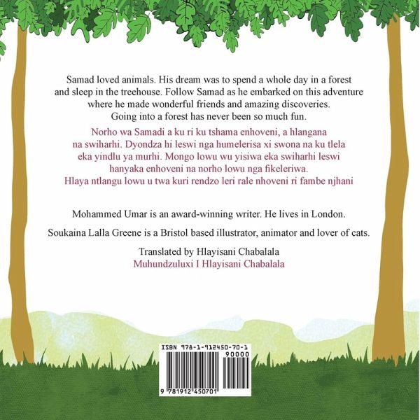 Samad loved animals. His dream was to spend a whole day in a forest and sleep in the treehouse. Follow Samad as he embarked on this adventure where he made wonderful friends and amazing discoveries. Going into a forest has never been so much fun. A bilingual edition of this book is available in the following languages: Acholi, Afrikaans Akwapim, Amharic, Asante, Bemba, Cameroonian Pidgen, Chichewa, Chinyanja, Ewe, Fante, Fulfulde, Ga, Gikuyu, Hausa, Igbo, Kalenjin, Kinyarwanda, Kirundi, Luganda, Luo, Ndebele, Nigerian Pidgen, Oromo, Shona, Sepedi, Sesotho, Somali, Setswana, Swahili, Thai, Tigrinya, Tshivenda, Tumbuka, Xhosa, Yoruba, Zulu.