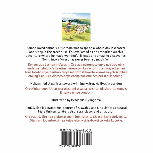 Samad loved animals. His dream was to spend a whole day in a forest and sleep in the treehouse. Follow Samad as he embarked on this adventure where he made wonderful friends and amazing discoveries. Going into a forest has never been so much fun. Kenyor apa Lesshan ing'wesin. Ore apa eyieunoto enye naa pee ebik endama nalulung'a te ntim neirura te nkaji entim. Iriamariyie Leshan tena lototo enye naishoo ninye menoto ilchoreta kumok neyolou imbaa enking'asia. Ore elototo enye entim naa ene nchipai sapuk naleng'.