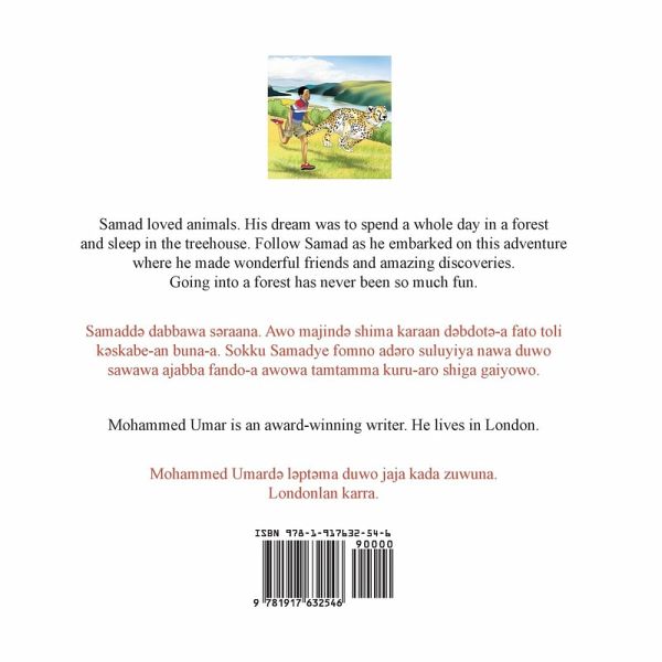 Samad loved animals. His dream was to spend a whole day in a forest and sleep in the treehouse. Follow Samad as he embarked on this adventure where he made wonderful friends and amazing discoveries. Going into a forest has never been so much fun. Samadd¿ dabbawa s¿raana. Awo majind¿ shima karaan d¿bdot¿-a fato toli k¿skabe-an buna-a. Sokku Samadye fomno ad¿ro suluyiya nawa duwo sawawa ajabba fando-a awowa tamtamma kuru-aro shiga gaiyowo.