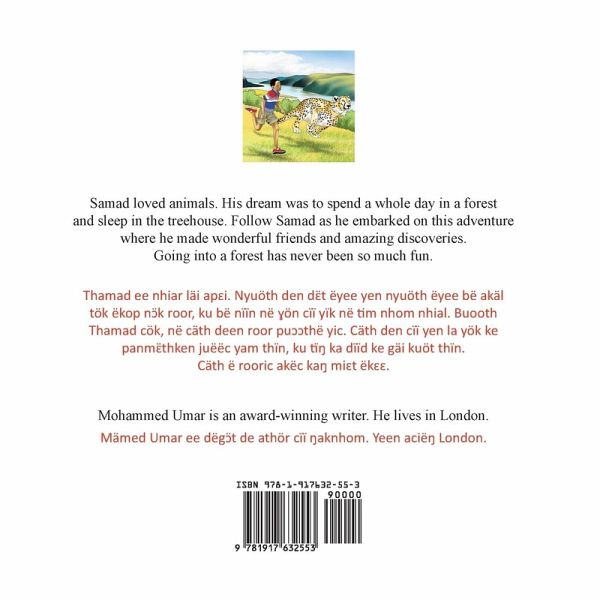 Samad loved animals. His dream was to spend a whole day in a forest and sleep in the treehouse. Follow Samad as he embarked on this adventure where he made wonderful friends and amazing discoveries. Going into a forest has never been so much fun. Thamad ee nhiar läi ap¿i. Nyuöth den d¿¿t ëyee yen nyuöth ëyee bë akäl tök ëkop n¿¿k roor, ku bë nïïn në ¿ön cïï yïk në tim nhom nhial. Buooth Thamad cök, në cäth deen roor pü¿thë yic. Cäth den cïï yen la yök ke panm¿¿thken juëëc yam thïn, ku tï¿ ka dïïd ke gäi kuöt thïn. Cäth ë rooric akëc kä mi¿t ëk¿¿. A bilingual edition of this book is available in the following languages: Acholi, Afar, Afrikaans Akwapim, Amharic, Arabic, Aramaic, Asante, Bandi, Bassa, Bemba, Burmese, Chichewa, Chinese, Chinyanja, Chokwe, Coptic, Dan, Dinka, Edo, Efik, Ekugesii, Emakwa, Fante, Finnish, Fon, Fulfulde, Ga, Gikuyu, Gola, Grebo, Gurage, Hadiyyasa, Harrari, Hausa, Ibibio, Igbo, Ijaw, Itsekiri, Kalabari, Kalanga, Kalenjin, Kamba, Kambaata, Kanembu, Kanuri, Khmer, Kiembu, Kikongo, Kimbundu, Kimeru, Kinyarwanda, Kirundi, Konso, Korean, Kpelle, Kru, Kunama, Kurdish, Lao, Lingala, Lomwe, Lorma, Luganda, Lubukusu, Luo, Maasai, Maan, Mandinka, Maninka, Mende, Ndebele, Mauritian Creole, Mongolian, Nobiin, Nuer, Nupe, Oromo, Pidgin, Sango, Portuguese, Runyoro-Rutooro, Shona, Sesotho, Sidama, Sepedi, Somali, Somali Osmanya, Setswana, Siswati, Soninke, Swahili, Swedish, Tagalog, Temne, Tigre, Tigrinya, Tumbuka, Tshiluba, Tshivenda, Turkish, Umbundu, Vai, Wolayita, Wolof, Xhosa, Xitsonga, Yao, Yoruba, Zarma, Zulu.