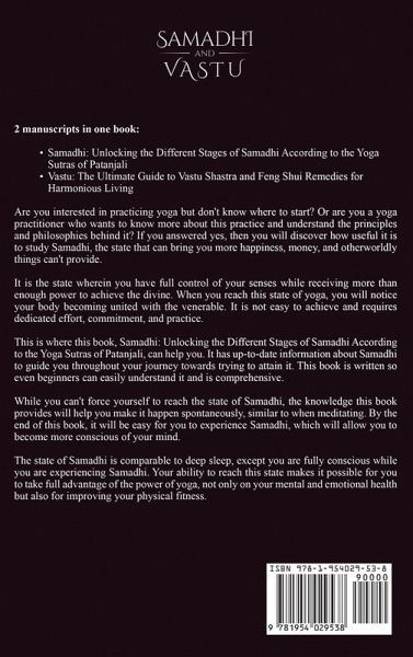 If you want to find a harmonious life and a harmonious living in flow with energy levels, then keep reading... Two manuscripts in one book:Samadhi: Unlocking the Different Stages of Samadhi According to the Yoga Sutras of Patanjali Vastu: The Ultimate Guide to Vastu Shastra and Feng Shui Remedies for Harmonious Living Part one of this book is the ultimate source of information about everything related to practicing Samadhi yoga. Whether you are a beginner or experienced yoga practitioner, or just someone interested in the practice, part one of this book will feed your curiosity about the entire Samadhi practice. The most incredible thing is that it can motivate and inspire you to start your journey towards reaching Samadhi as soon as possible. It will arm you with all the relevant and up-to-date information about the practice. It can even teach you the most modern techniques for practicing Samadhi. Complex concepts and terms of Samadhi are also explained in a simple and easy-to-understand manner. With part one of this book, you will discover:Relevant information about the yoga sutras. Who Patanjali is, and easy-to-understand concepts about the yoga sutras he introduced to the world. A brief history of ashtanga yoga. The 8-fold path of yoga and how important it is when trying to reach Samadhi. The different stages and types of Samadhi. Benefits of attaining Samadhi. How to reach Kaivalya, the ultimate goal of Samadhi. Modern techniques for practicing Samadhi. How to make Samadhi yoga and meditation a part of your life. Part two of this book describes the ancient Indian science called Vastu Shastra. By observing modern life through the lens of Vastu, you'll come to grasp just how timeless this design philosophy is. You can expect to find great, intuitive ways to integrate ancient and mystical concepts into modern buildings with ease. The essential Vastu principles will be explained to ensure that beginners can grasp the knowledge and concepts analyzed. It familiarizes the reader with each vibration and form of energy in the Vastu Shastra. Throughout this volume, you'll get to:Take a walk through ancient India's buildings and learn what factors were considered in their design, from conception to construction. Understand the deep relation between Feng Shui and Vastu Shastra, in addition to their intersections and divergences. Learn what makes a place balanced, tranquil, and harmonious so you can set your own standards. Learn how you can use Vastu principles professionally when designing a building from scratch. Discover the effectiveness of Vastu in your home and its advantages. Discover whether your house is affected by the Sick Building Syndrome (SBS). Learn how you can use the precepts of Vastu to improve and optimize your workplace (offices, hospitals, etc.). Gain insight on how to choose a Vastu-compliant workspace or home. Learn about the amazing ways you can use Vastu to integrate green spaces into your life. Discover how you can dispel negative energy and recreate it according to Vastu Principles. Scroll up and click the "add to cart" button and ready to begin your journey towards a well-balanced, optimized, and harmonious life!