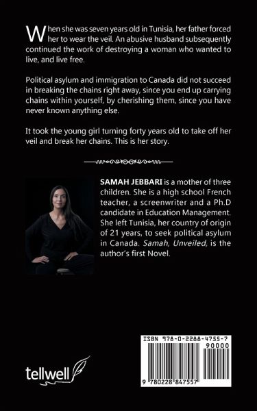 When she was seven years old in Tunisia, her father forced her to wear the veil. An abusive husband subsequently continued the work of destroying a woman who wanted to live, and live free. Political asylum and immigration to Canada did not succeed in breaking the chains right away, since you end up carrying chains within yourself, by cherishing them, since you have never known anything else. It took the young girl turning forty years old to take off her veil and break her chains. This is her story.