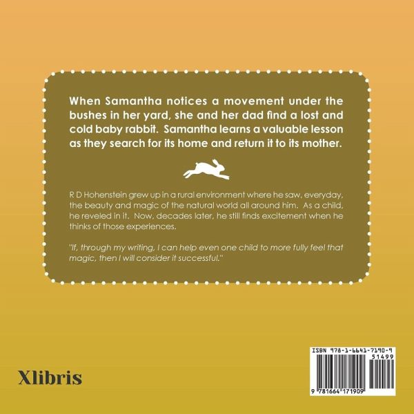When Samantha notices a movement under the bushes in her yard, she and her dad find a lost and cold baby rabbit. Samantha learns a valuable lesson as they search for its home and return it to its mother.