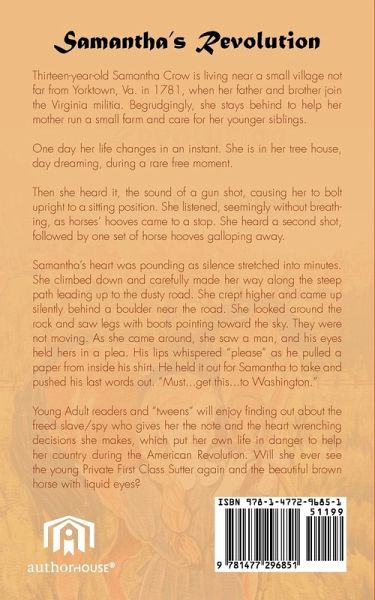 Thirteen-year-old Samantha Crow is living near a small village not far from Yorktown, Va. in 1781, when her father and brother join the Virginia militia. Begrudgingly, she stays behind to help her mother run a small farm and care for her younger siblings. One day her life changes in an instant. She is in her tree house, day dreaming, during a rare free moment. Then she heard it, the sound of a gun shot, causing her to bolt upright to a sitting position. She listened, seemingly without breathing, as horses' hooves came to a stop. She heard a second shot, followed by one set of horse hooves galloping away. Samantha's heart was pounding as silence stretched into minutes. She climbed down and carefully made her way along the steep path leading up to the dusty road. She crept higher and came up silently behind a boulder near the road. She looked around the rock and saw legs with boots pointing toward the sky. They were not moving. As she came around, she saw a man, and his eyes held hers in a plea. His lips whispered "please" as he pulled a paper from inside his shirt. He held it out for Samantha to take and pushed his last words out. "Must...get this...to Washington." Young Adult readers and "tweens" will enjoy finding out about the freed slave/spy who gives her the note and the heart wrenching decisions she makes, which put her own life in danger to help her country during the American Revolution. Will she ever see the young Private First Class Sutter again and the beautiful brown horse with liquid eyes?
