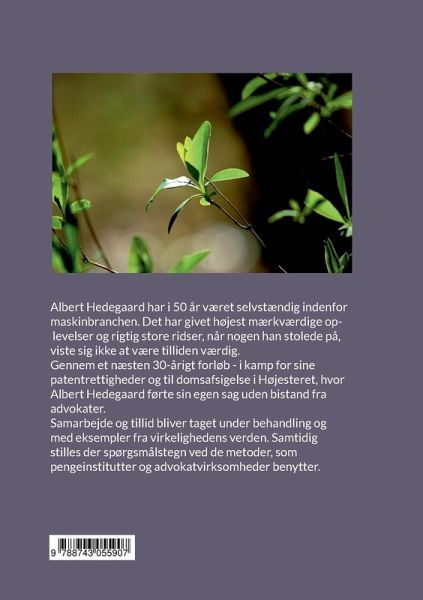 Albert Hedegaard har i 50 år været selvstændig indenfor maskinbranchen. Det har givet højest mærkværdige oplevelser og særdeles store skrammer, når nogen han stolede blindt på i sin ungdom, viste sig ikke at være tilliden værdig. Senere - gennem et næsten 30-årigt forløb - i kamp for nogle patentrettigheder og til domsafsigelse i Højesteret, hvor Albert Hedegaard førte sin egen sag uden bistand af advokater. Samarbejde og tillid bliver taget under behandling og med eksempler fra virkelighedens verden. Samtidig stilles der spørgsmålstegn ved de metoder som pengeinstitutter og advokatfirmaer benytter sig af.