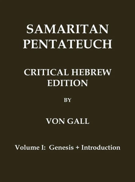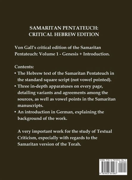 Von Gall's critical edition of the Samaritan Pentateuch: Volume 1 - Genesis + Introduction. Contents:The Hebrew text of the Samaritan Pentateuch in the standard square script (not vowel pointed). 3 in-depth apparatuses on every page, detailing variants and agreements among the sources, as well as vowel points in the Samaritan manuscripts. An introduction in German, explaining the background of the work. A very important work for the study of Textual Criticism, especially with regards to the Samaritan version of the Torah.