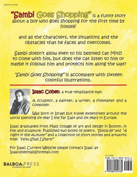 "Sambi Goes Shopping" is a funny story about a boy who goes shopping for the first time by himself and all the characters, the situations and the obstacles that he faces and overcomes. Sambi doesn't allow even to his beloved cat Mitzi to come with him, but does the cat listen to him or maybe it follows him and protects him along the way? "Sambi Goes Shopping" is accompany with sixteen colorful illustrations.