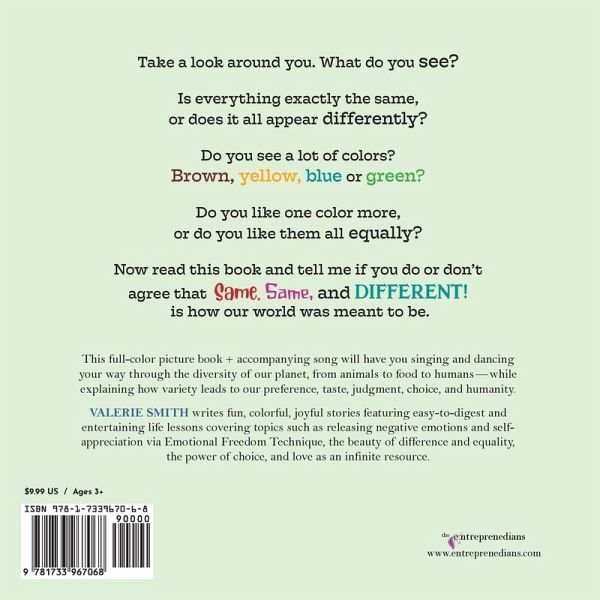 Take a look around you. What do you see? Is everything exactly the same or does it all appear differently? Do you see a lot of colors? Brown, yellow, blue, or green? Do you like one color more or do you like them all equally? Now read this book and tell me if you do or don't agree, that Same, Same, and Different! is how our world is meant to be. Same, Same, and Different! takes us on a lyrical journey through the diversity of our planet, from animals to food to humans-while explaining how variety leads to preference, taste, judgment, choice, and humanity. This full-color picture book, with accompanying scan-and-play song, is perfect for both children and adults to learn about diversity and choice. Valerie Smith writes fun, colorful, joyful stories featuring easy-to-digest and entertaining life lessons covering topics such as releasing negative emotions and self-appreciation via Emotional Freedom Technique (EFT or tapping), the beauty of difference and equality, the power of choice, and love as an infinite resource.