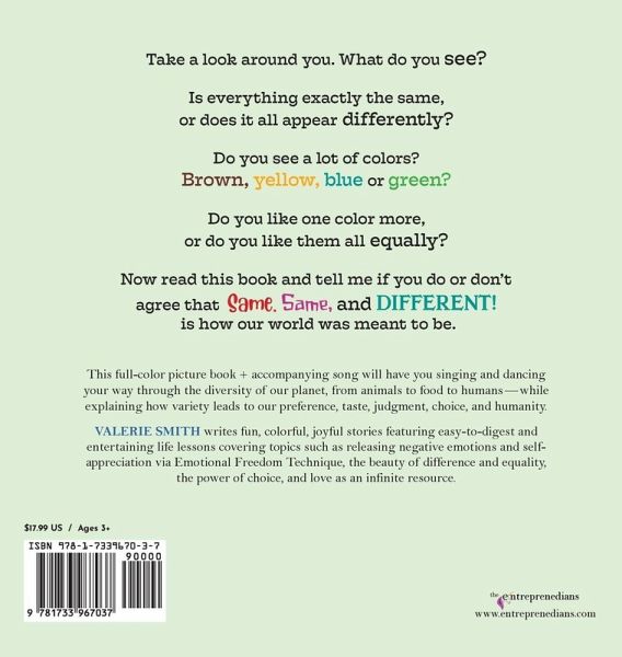 Take a look around you. What do you see? Is everything exactly the same or does it all appear differently? Do you see a lot of colors? Brown, yellow, blue, or green? Do you like one color more or do you like them all equally? Now read this book and tell me if you do or don't agree, that Same, Same, and Different! is how our world is meant to be. Same, Same, and Different! takes us on a lyrical journey through the diversity of our planet, from animals to food to humans-while explaining how variety leads to preference, taste, judgment, choice, and humanity. This full-color picture book, with accompanying scan-and-play song, is perfect for both children and adults to learn about diversity and choice. Valerie Smith writes fun, colorful, joyful stories featuring easy-to-digest and entertaining life lessons covering topics such as releasing negative emotions and self-appreciation via Emotional Freedom Technique (EFT or tapping), the beauty of difference and equality, the power of choice, and love as an infinite resource.