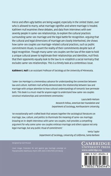 Fierce and often ugly battles are being waged, especially in the United States, over who is allowed to marry, what marriage signifies, and where marriage is headed. Kathleen Hull examines these debates, and data from interviews with over seventy people in same-sex relationships, to explore the cultural practices surrounding same-sex marriage and the legal battle for recognition. Arguing that the cultural and legal dimensions of marriage are closely intertwined, she shows how same-sex couples use marriage-related cultural practices, such as public commitment rituals, to assert the reality of their commitments despite lack of legal recognition. Though many same-sex couples see the law of the state to hold a unique cultural power to legitimate their relationships and identities, Hull finds that their opponents equally look to the law to re-establish a social normalcy that excludes same-sex relationships. This is a timely look at a contentious issue.