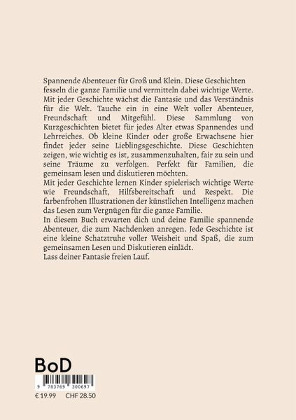 Spannende Abenteuer für Groß und Klein. Diese Geschichten fesseln die ganze Familie und vermitteln dabei wichtige Werte. Mit jeder Geschichte wächst die Fantasie und das Verständnis für die Welt. Tauche ein in eine Welt voller Abenteuer, Freundschaft und Mitgefühl. Diese Sammlung von Kurzgeschichten bietet für jedes Alter etwas Spannendes und Lehrreiches. Ob kleine Kinder oder große Erwachsene hier findet jeder seine Lieblingsgeschichte. Diese Geschichten zeigen, wie wichtig es ist, zusammenzuhalten, fair zu sein und seine Träume zu verfolgen. Perfekt für Familien, die gemeinsam lesen und diskutieren möchten. Mit jeder Geschichte lernen Kinder spielerisch wichtige Werte wie Freundschaft, Hilfsbereitschaft und Respekt. Die farbenfrohen Illustrationen der künstlichen Intelligenz machen das Lesen zum Vergnügen für die ganze Familie. In diesem Buch erwarten dich und deine Familie spannende Abenteuer, die zum Nachdenken anregen. Jede Geschichte ist eine kleine Schatztruhe voller Weisheit und Spaß, die zum gemeinsamen Lesen und Diskutieren einlädt. Lass deiner Fantasie freien Lauf.