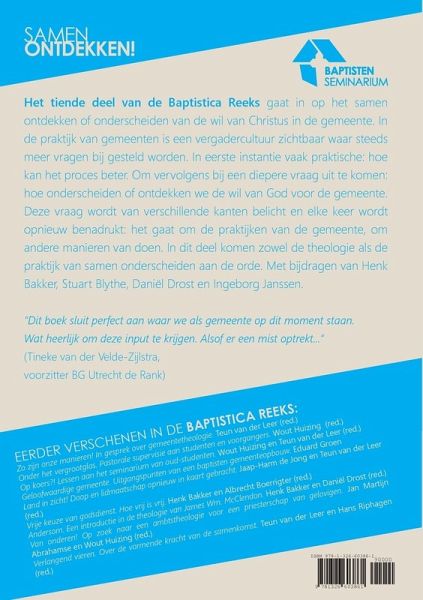 Het tiende deel van de Baptistica Reeks gaat in op het samen ontdekken of onderscheiden van de wil van Christus in de gemeente. In de praktijk van gemeenten is een vergadercultuur zichtbaar waar steeds meer vragen bij gesteld worden. In eerste instantie vaak praktische: hoe kan het proces beter. Om vervolgens bij een diepere vraag uit te komen: hoe onderscheiden of ontdekken we de wil van God voor de gemeente. Deze vraag wordt van verschillende kanten belicht en elke keer wordt opnieuw benadrukt: het gaat om de praktijken van de gemeente, om andere manieren van doen. In dit deel komen zowel de theologie als de praktijk van samen onderscheiden aan de orde. Met bijdragen van Henk Bakker, Stuart Blythe, Daniël Drost en Ingeborg Janssen.