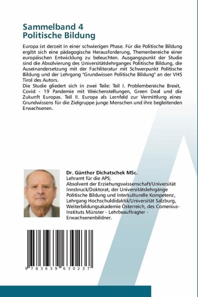 Europa ist derzeit in einer schwierigen Phase. Für die Politische Bildung ergibt sich eine pädagogische Herausforderung, Themenbereiche einer europäischen Entwicklung zu beleuchten. Ausgangspunkt der Studie sind die Absolvierung des Universitätslehrganges Politische Bildung, die Auseinandersetzung mit der Fachliteratur mit Schwerpunkt Politische Bildung und der Lehrgang "Grundwissen Politische Bildung" an der VHS Tirol des Autors.Die Studie gliedert sich in zwei Teile: Teil I. Problembereiche Brexit, Covid - 19 Pandemie mit Weichenstellungen, Green Deal und die Zukunft Europas. Teil II. Europa als Lernfeld zur Vermittlung eines Grundwissens für die Zielgruppe junge Menschen und ihre begleitenden Erwachsenen.