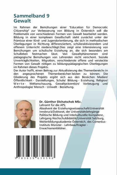 Im Rahmen der Bemühungen einer "Education für Democratic Citizenship" zur Verbesserung von Bildung in Österreich soll die Problematik von verschiedenen Formen von Gewalt bearbeitet werden. Bildung in einer komplexen Gesellschaft steht zunächst unter der Prämisse einer Kind- und Jugendorientierung, die sich in methodischen Überlegungen in Richtung differenziertem, schüleraktivierendem und offenem Unterricht niederschlägt.Dies zeigt eine Intensivierung von Bemühungen um schulische Erziehung an, die sich besonders am Schulleben festmachen lässt. Von Gewaltphänomenen sind pädagogische Bemühungen von Lehrenden nicht verschont. Soziale Unverträglichkeiten, Migration, verschiedenste offene und versteckte Formen von Gewalt nötigen zu bildungspädagogischen Überlegungen im Rahmen dieses Projekts. Der Autor hofft, einen Beitrag zur Aktualisierung des Themenbereichs in den angesprochenen Themenbereichen leisten zu können. Die Gliederung des Projekts ergibt sich aus den Bereichen Medien/ Öffentlichkeit - Darstellungen, Schule/ Bildung - Erziehung, Religion/ Werte - Weltanschauung, Gewaltprävention/ Vorbeugung und Anthropologie/ Mensch - Umwelt - Beziehung.