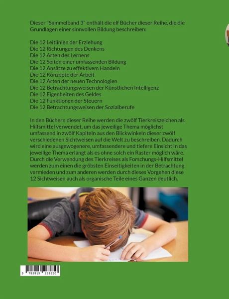 Dieser "Sammelband 3" enthält die elf Bücher dieser Reihe, die die Grundlagen einer sinnvollen Bildung beschreiben: Die 12 Leitlinien der Erziehung Die 12 Richtungen des Denkens Die 12 Arten des Lernens Die 12 Seiten einer umfassenden Bildung Die 12 Ansätze zu effektivem Handeln Die 12 Konzepte der Arbeit Die 12 Arten der neuen Technologien Die 12 Betrachtungsweisen der Künstlichen Intelligenz Die 12 Eigenheiten des Geldes Die 12 Funktionen der Steuern Die 12 Betrachtungsweisen der Sozialberufe In den Büchern dieser Reihe werden die zwölf Tierkreiszeichen als Hilfsmittel verwendet, um das jeweilige Thema möglichst umfassend in zwölf Kapiteln aus den Blickwinkeln dieser zwölf verschiedenen Sichtweisen auf die Welt zu beschreiben. Dadurch wird eine ausgewogenere, umfassendere und tiefere Einsicht in das jeweilige Thema erlangt als es ohne solch ein Raster möglich wäre. Durch die Verwendung des Tierkreises als Forschungs-Hilfsmittel werden zum einen die gröbsten Einseitigkeiten in der Betrachtung vermieden und zum anderen werden durch dieses Vorgehen diese 12 Sichtweisen auch als organische Teile eines Ganzen deutlich.