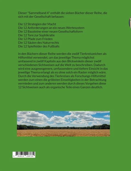 Dieser "Sammelband 4" enthält die sieben Bücher dieser Reihe, die sich mit der Gesellschaft befassen: Die 12 Strategien der Macht Die 12 Anforderungen an ein neues Wertesystem Die 12 Bausteine einer neuen Gesellschaftsform Die 12 Tore zur Sophikratie Die 12 Pfade zum Frieden Die 12 Säulen des Naturrechts Die 12 Spielfelder des Fußballs In den Büchern dieser Reihe werden die zwölf Tierkreiszeichen als Hilfsmittel verwendet, um das jeweilige Thema möglichst umfassend in zwölf Kapiteln aus den Blickwinkeln dieser zwölf verschiedenen Sichtweisen auf die Welt zu beschreiben. Dadurch wird eine ausgewogenere, umfassendere und tiefere Einsicht in das jeweilige Thema erlangt als es ohne solch ein Raster möglich wäre. Durch die Verwendung des Tierkreises als Forschungs-Hilfsmittel werden zum einen die gröbsten Einseitigkeiten in der Betrachtung vermieden und zum anderen werden durch dieses Vorgehen diese 12 Sichtweisen auch als organische Teile eines Ganzen deutlich.