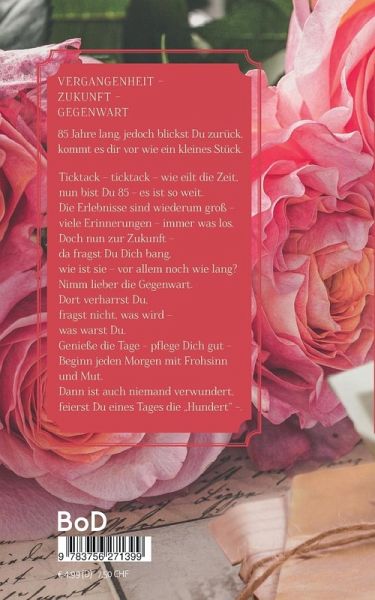 Vergangenheit - Zukunft - Gegenwart 85 Jahre lang, jedoch blickst Du zurück, kommt es dir vor wie ein kleines Stück. Ticktack - ticktack - wie eilt die Zeit, nun bist Du 85 - es ist so weit. Die Erlebnisse sind wiederum groß - viele Erinnerungen - immer was los. Doch nun zur Zukunft - da fragst Du Dich bang, wie ist sie - vor allem noch wie lang? Nimm lieber die Gegenwart. Dort verharrst Du, fragst nicht, was wird -was warst Du. Genieße die Tage - pflege Dich gut - Beginn jeden Morgen mit Frohsinn und Mut. Dann ist auch niemand verwundert, feierst Du eines Tages die "Hundert".