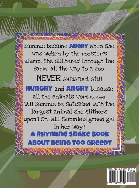 A rhyming snake book about being too greedy. Sammie became Angry when she was woken by the rooster's alarm. She slithered through the farm, all the way to a zoo. NEVER satisfied, still HUNGRY and ANGRY because all the animals were too small. Will Sammie be satisfied with the largest animal she slithers upon? Or will Sammie's greed get in her way? Sammie the Hungry Angry Never Satissssfied Snake teaches children that they should be satisfied with choices and options in life. One day they might not have the opportunity, because they were too greedy always wanting more. This book great for children that Love:Snakes Farm animals Zoo animals Rhyming books