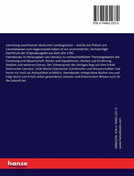 Sammlung auserlesener deutschen Landesgesetze - welche das Policei und Cameralwesen zum Gegenstande haben ist ein unveränderter, hochwertiger Nachdruck der Originalausgabe aus dem Jahr 1783.