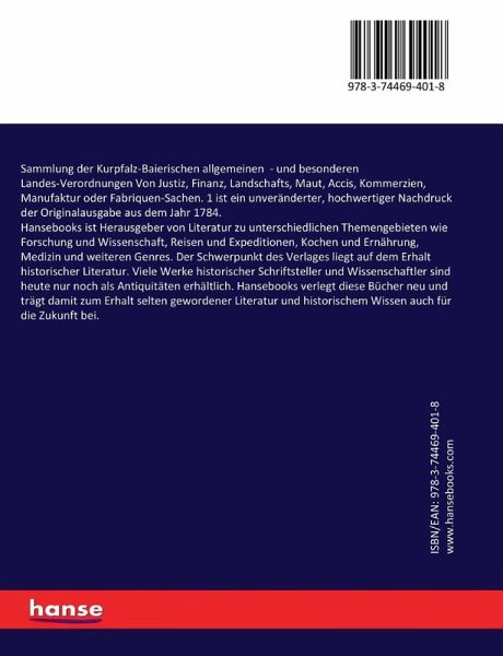 Sammlung der Kurpfalz-Baierischen allgemeinen - und besonderen Landes-Verordnungen Von Justiz, Finanz, Landschafts, Maut, Accis, Kommerzien, Manufaktur oder Fabriquen-Sachen. 1 ist ein unveränderter, hochwertiger Nachdruck der Originalausgabe aus dem Jahr 1784.