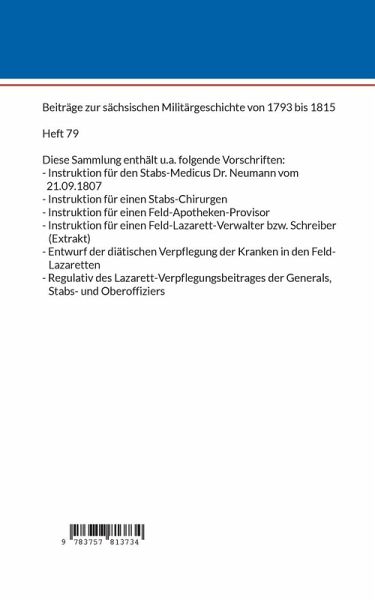Diese Sammlung enthält u.a. folgende Vorschriften:- Instruktion für den Stabs-Medicus Dr. Neumann vom 21.09.1807- Instruktion für einen Stabs-Chirurgen- Instruktion für einen Feld-Apotheken-Provisor- Instruktion für einen Feld-Lazarett-Verwalter bzw. Schreiber (Extrakt) - Entwurf der diätischen Verpflegung der Kranken in den Feld-Lazaretten - Regulativ des Lazarett-Verpflegungsbeitrages der Generals, Stabs- und Oberoffiziers