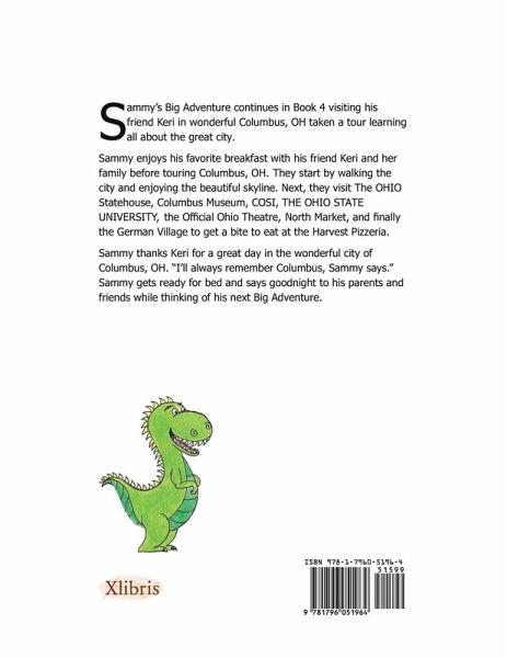 Sammy's Big Adventure continues in Book 4 visiting his friend Keri in wonderful Columbus, OH taken a tour learning all about the great city. Sammy enjoys his favorite breakfast with his friend Keri and her family before touring Columbus, OH. They start by walking the city and enjoying the beautiful skyline. Next, they visit The OHIO Statehouse, Columbus Museum, COSI, THE OHIO STATE UNIVERSITY, the Official Ohio Theatre, North Market, and finally the German Village to get a bite to eat at the Harvest Pizzeria. Sammy thanks Keri for a great day in the wonderful city of Columbus, OH. "I'll always remember Columbus, Sammy says." Sammy gets ready for bed and says goodnight to his parents and friends while thinking of his next Big Adventure.