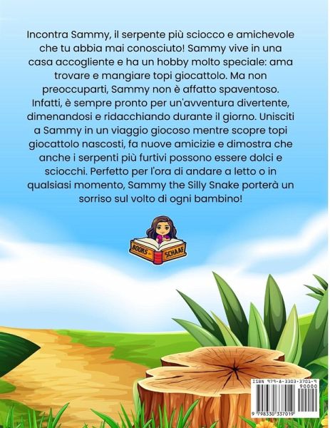 Incontra Sammy, il serpente più sciocco e amichevole che tu abbia mai conosciuto! Sammy vive in una casa accogliente e ha un hobby molto speciale: ama trovare e mangiare topi giocattolo. Ma non preoccuparti, Sammy non è affatto spaventoso. Infatti, è sempre pronto per un'avventura divertente, dimenandosi e ridacchiando durante il giorno. Unisciti a Sammy in un viaggio giocoso mentre scopre topi giocattolo nascosti, fa nuove amicizie e dimostra che anche i serpenti più furtivi possono essere dolci e sciocchi. Perfetto per l'ora di andare a letto o in qualsiasi momento, Sammy the Silly Snake porterà un sorriso sul volto di ogni bambino!¿