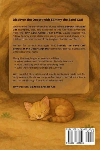 Discover the Desert with Sammy the Sand Cat! Welcome to the sun-drenched dunes where Sammy the Sand Cat scampers, digs, and explores! In this fun-filled adventure from the Tiny Tails Animal Fact Series, young readers will follow Sammy as he shares his sandy secrets and shows what it takes to survive in one of the toughest habitats on Earth. Perfect for curious kids ages 4-8, Sammy the Sand Cat: Secrets of the Desert Explorer combines playful illustrations with real animal facts. Along the way, beginner readers will learn:What makes sand cats different from house cats How they stay cool in the scorching heat Why they're masters of desert survival With colorful illustrations and simple sentences made just for early readers, this book is a purr-fect way to introduce science and nature through fun animal adventures! Tiny creature. Big facts. Endless fun!
