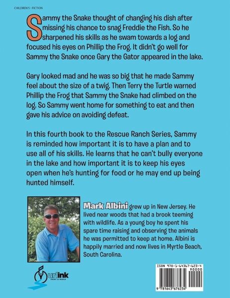 Sammy and the Snake thought of changing his dish after missing his chance to snag Freddie the Fish. So he sharpened his skills as he swam towards a log and focused his eyes on Phillip the Frog. It didn't go well for Sammy the Snake once Gary the Gator appeared in the lake. Gary looked mad and he was so big that he made Sammy feel about the size of a twig. Then Terry the Turtle warned Phillip the Frog that Sammy the Snake had climbed on the log. So Sammy went home for something to eat and then gave his advice on avoiding defeat. In this fourth book to the Rescue Ranch Series, Sammy is reminded how important it is to have a plan and to use all of his skills. He learns that he can't bully everyone in the lake and how important it is to keep his eyes open when he's hunting for food or he may end up being hunted himself.