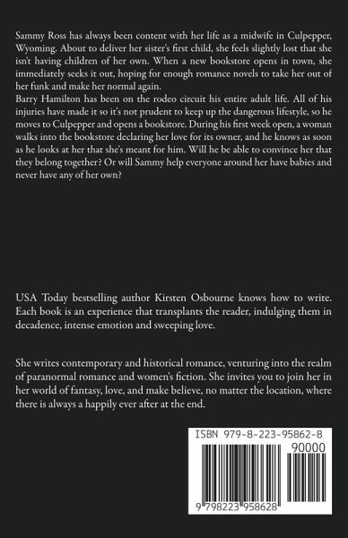 Sammy Ross has always been content with her life as a midwife in Culpepper, Wyoming. About to deliver her sister's first child, she feels slightly lost that she isn't having children of her own. When a new bookstore opens in town, she immediately seeks it out, hoping for enough romance novels to take her out of her funk and make her normal again. Barry Hamilton has been on the rodeo circuit his entire adult life. All of his injuries have made it so it's not prudent to keep up the dangerous lifestyle, so he moves to Culpepper and opens a bookstore. During his first week open, a woman walks into the bookstore declaring her love for its owner, and he knows as soon as he looks at her that she's meant for him. Will he be able to convince her that they belong together? Or will Sammy help everyone around her have babies and never have any of her own?