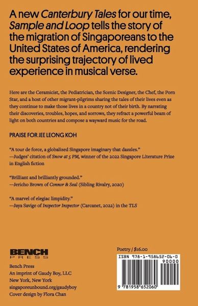 A new Canterbury Tales for our time, Sample and Loop tells the story of the migration of Singaporeans to the United States of America, rendering the surprising trajectory of lived experience in musical verse. Based on personal interviews, these poems together tell a part of the story of the migration of Singaporeans to the United States of America. A new Canterbury Tales for our time, Sample and Loop traces the nonlinear, multidimensional, and surprising trajectory of lived experience in musical verse. Here are the Ceramicist, the Pediatrician, the Scenic Designer, the Chef, the Porn Star, and a host of other migrant-pilgrims sharing the tales of their lives even as they continue to make those lives in a country not of their birth. By narrating their discoveries, troubles, hopes, and sorrows, they refract a powerful beam of light on both countries and compose a wayward music for the road.