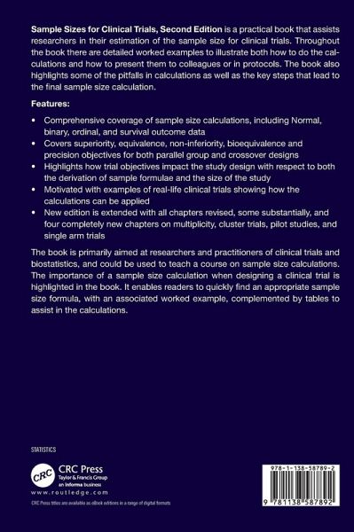 Comprehensive coverage of sample size calculations, including Normal, binary, ordinal, and survival outcome dataCovers superiority, equivalence, non-inferiority, bioequivalence and precision objectives for both parallel group and crossover designsHighlights how trial objectives impact the study design with respect to both the derivation of sample formulae and the size of the studyMotivated with examples of real-life clinical trials showing how the calculations can be appliedNew edition is extended with all chapters revised, some substantially, and four completely new chapters on multiplicity, cluster trials, pilot studies, and single arm trials