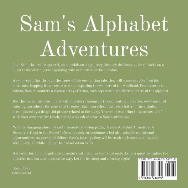 Welcome to "Sam's Alphabet Adventure: A Scavenger Hunt in the Forest!" As your child flips through the pages of this enchanting tale, they will accompany Sam on his adventure, hopping from tree to tree and exploring the wonders of the woodland. From acorns to zebras, Sam encounters a diverse array of items, each representing a different letter of the alphabet. But the excitement doesn't end with the story! Alongside the captivating narrative, we've included coloring worksheets for your child to enjoy. Each worksheet features a letter of the alphabet accompanied by a delightful picture related to the story. Your child can bring these scenes to life with their own creative touch, adding a splash of color to Sam's adventure. With its engaging storyline and interactive coloring pages, "Sam's Alphabet Adventure: A Scavenger Hunt in the Forest" offers not only entertainment but also valuable educational opportunities. As your child follows Sam's journey, they will learn about letters, sounds, and vocabulary, all while honing their observation skills. Get ready for an unforgettable adventure with Sam as your child embarks on a quest to explore the alphabet in a fun and imaginative way. Let the learning and coloring begin! "Sam's Alphabet Adventure: A Scavenger Hunt in the Forest" is the perfect blend of entertainment and education, making it a must-have addition to any child's bookshelf.