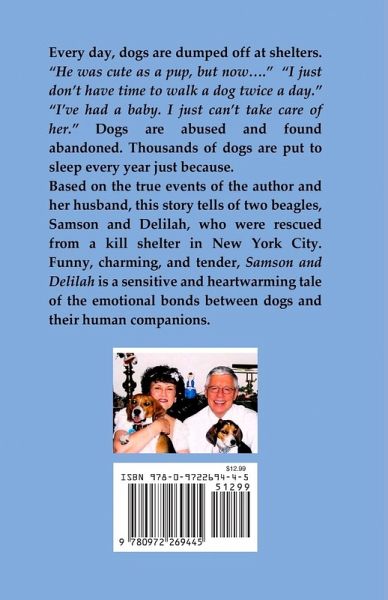 Dogs are forever. They are not to be tossed aside because they don't fit our version of a perfect dog. They kiss away our tears, cuddle next to us when we are sad, greet us with excitement and high spirits, even if we are in a bad mood, and stay by our side in times of trouble and tears. They know very well the meaning of the words, "till death do us part." Based on true events that happened to Elizabeth and her husband, David, Samson and Delilah, is a heartwarming story about two very different, adorable beagles, and how they each captured their guardians' hearts and formed a bond that would be cherished always. This journey shows how we love and protect those closest to our hearts. With humor and humility, the author reveals what it's like to open your heart to not one, but two loveable beagles. The story also shares the challenges encountered in living with two dogs in a New York City apartment and the joy of having two quirky dogs like Samson and Delilah. While this book is candid and sincere and sad and funny, it focuses on the issues of giving dogs a second chance. Sharing the antics and adventures of Samson and Delilah, this book shows how to work through the challenges that may arise in that most valuable and rewarding of relationships. Most importantly, it will also inspire people to take action to rescue a dog-maybe two.