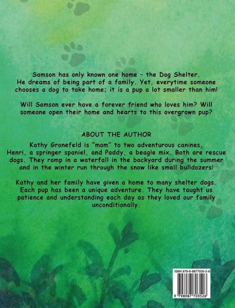 Samson has only one home - the Dog Shelter. He dreams of being part of a family. Yet, every time someone chooses a dog to take home; it is a pup a lot smaller than him! Will Samson ever have a forever friend who loves him? Will someone open their home and hearts to this overgrown pup?