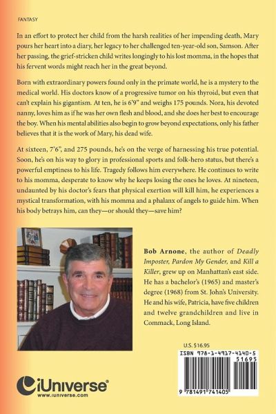In an effort to protect her child from the harsh realities of her impending death, Mary pours her heart into a diary, her legacy to her challenged ten-year-old son, Samson. After her passing, the grief-stricken child writes longingly to his lost momma, in the hopes that his fervent words might reach her in the great beyond. Born with extraordinary powers found only in the primate world, he is a mystery to the medical world. His doctors know of a progressive tumor on his thyroid, but even that can¿t explain his gigantism. At ten, he is 6¿9¿ and weighs 175 pounds. Nora, his devoted nanny, loves him as if he was her own flesh and blood, and she does her best to encourage the boy. When his mental abilities also begin to grow beyond expectations, only his father believes that it is the work of Mary, his dead wife. At sixteen, 7¿6¿, and 275 pounds, he¿s on the verge of harnessing his true potential. Soon, he¿s on his way to glory in professional sports and folk-hero status, but there¿s a powerful emptiness to his life. Tragedy follows him everywhere. He continues to write to his momma, desperate to know why he keeps losing the ones he loves. At nineteen, undaunted by his doctor¿s fears that physical exertion will kill him, he experiences a mystical transformation, with his momma and a phalanx of angels to guide him. When his body betrays him, can they¿or should they¿save him?