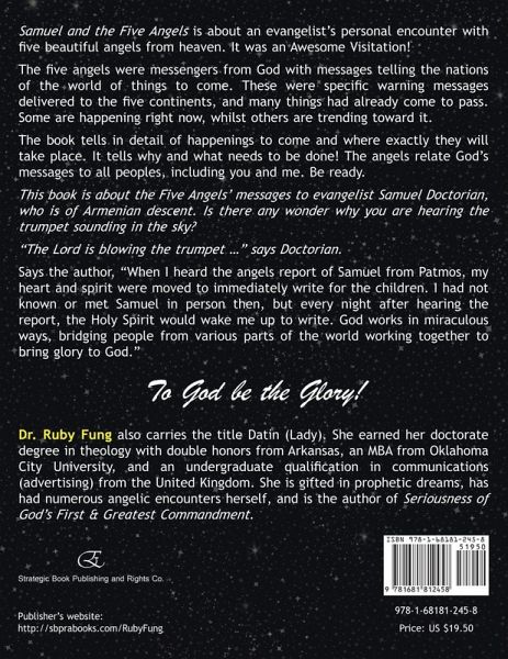 Samuel and the Five Angels is about an evangelist's personal encounter with five beautiful angels from heaven. It was an Awesome Visitation! The five angels were messengers from God with messages telling the nations of the world of things to come. These were specific warning messages delivered to the five continents, and many things had already come to pass. Some are happening right now, whilst others are trending toward it. The book tells in detail of happenings to come and where exactly they will take place. It tells why and what needs to be done! The angels relate God's messages to all peoples, including you and me. Be ready. This book is about the Five Angels' messages to evangelist Samuel Doctorian, who is of Armenian descent. Is there any wonder why you are hearing the trumpet sounding in the sky? "The Lord is blowing the trumpet ..." says Doctorian. Says the author, "When I heard the angels report of Samuel from Patmos, my heart and spirit were moved to immediately write for the children. I had not known or met Samuel in person then, but every night after hearing the report, the Holy Spirit would wake me up to write. God works in miraculous ways, bridging people from various parts of the world working together to bring glory to God." To God be the Glory! Dr. Ruby Fung also carries the title Datin (Lady). She earned her doctorate degree in theology with double honors from Arkansas, an MBA from Oklahoma City University, and an undergraduate qualification in communications (advertising) from the United Kingdom. She is gifted in prophetic dreams, has had numerous angelic encounters herself, and is the author of Seriousness of God's First & Greatest Commandment. Publisher's website: http://sbprabooks.com/RubyFung