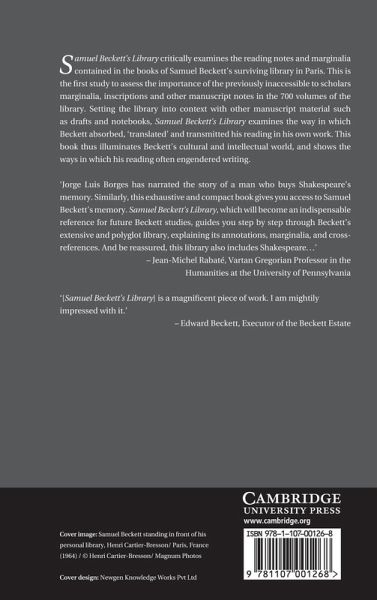Samuel Beckett's Library critically examines the reading notes and marginalia contained in the books of Samuel Beckett's surviving library in Paris. Previously inaccessible to scholars, this is the first study to assess the importance of the marginalia, inscriptions, and other manuscript notes in the 750 volumes of the library. Setting the library into context with other manuscript material such as drafts and notebooks, this book examines the way in which Beckett absorbed, 'translated', and transmitted his reading in his own work. It thus illuminates Beckett's cultural and intellectual world, and shows the ways in which his reading often engendered writing.