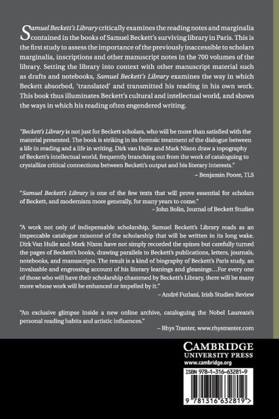 Samuel Beckett's Library critically examines the reading notes and marginalia contained in the books of Samuel Beckett's surviving library in Paris. Previously inaccessible to scholars, this is the first study to assess the importance of the marginalia, inscriptions, and other manuscript notes in the 750 volumes of the library.