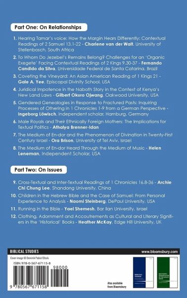 Series Preface Abbreviations Introduction - Athalya Brenner-Idan, Universiteit van Amsterdam, The Netherlands, and Tel Aviv University, Israel Part One: On Relationships A. Leading Female Figures in Kings and Chronicles and Their Family Connections 1. Hearing Tamar's voice - How the Margin Hears Differently: Contextual readings of 2 Samuel 13.1-22 - Charlene van der Walt, University of Stellenbosch, South Africa 2. To Whom Do Jezebel's Remains Belong? Challenges for an 'Organic Exegete' Facing Contextual Readings of 2 Kings 9.30-37 - Fernando Candido da Silva, Universidade Federal de Santa Catarina, Brazil 3. Coveting the Vineyard: An Asian American Reading of 1 Kings 21 - Gale A. Yee, Episcopal Divinity School, USA 4. Juridical Impotence in the Naboth Story in the Context of Kenya's New Land Laws - Gilbert Okuro Ojwang, Oakwood University, USA 5. Gendered Genealogies in Response to Fractured Pasts: Inquiring Processes of Othering in 1 Chronicles 1-9 from a German Perspective - Ingeborg Löwisch, University of Bern, Switzerland B. The Medium Of En-dor 6. The Medium of En-dor and the Phenomenon of Divination in Twenty-First Century Israel - Ora Brison, University of Tel Aviv, Israel 7. The medium of En-dor Heard through the Medium of Music - Helen Leneman, Independent Scholar, USA Part Two: On Issues 8. Reading the Psalms of 1 Chronicle 16. 8-36 in the Chinese and Biblical Contexts Archie C.C Lee, Shandong University, China 9. Children in the Hebrew Bible and the Case of Samuel: From Personal Experience to Analysis - Naomi Steinberg, DePaul University, USA 10. Running in the Bible - Yael Shemesh, Bar Ilan University, Israel 11. Clothing, Adornment and Accoutrements as Cultural and Literary Signifiers in the 'Historical' Books - Heather McKay, Edge Hill University, UK 12. Male Royals and Their Ethnically Foreign Mothers: The Implications for Textual Politics, Athalya Brenner-Idan, Universiteit van Amsterdam, The Netherlands, and Tel Aviv University, Israel Index of Scriptures Index of Authors