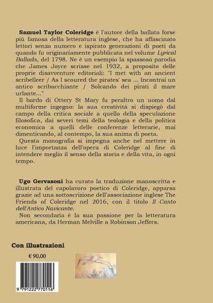 Samuel Taylor Coleridge è l'autore della ballata forse più famosa della letteratura inglese, che ha affascinato lettori senza numero e ispirato generazioni di poeti da quando fu originariamente pubblicata nel volume Lyrical Ballads, del 1798. Ne è un esempio la spassosa parodia che James Joyce scrisse nel 1932, a proposito delle proprie disavventure editoriali: "I met with an ancient scribelleer / As I scoured the pirates' sea ... Incontrai un antico scribacchiante / Solcando dei pirati il mare urlante..." Il bardo di Ottery St Mary fu peraltro un uomo dal multiforme ingegno: la sua creatività si dispiegò dal campo della critica sociale a quello della speculazione filosofica, dai severi temi della teologia e della politica economica a quelli delle conferenze letterarie, mai dimenticando, al contempo, la sua anima di poeta. Questa monografia si impegna anche nel mettere in luce l'importanza dell'opera di Coleridge al fine di intendere meglio il senso della storia e della vita, in ogni tempo.