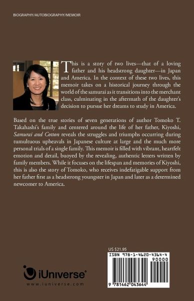 This is a story of two lives-that of a loving father and his headstrong daughter-in Japan and America. In the context of these two lives, this memoir takes on a historical journey through the world of the samurai as it transitions into the merchant class, culminating in the aftermath of the daughter's decision to pursue her dreams to study in America. Based on the true stories of seven generations of author Tomoko T. Takahashi's family and centered around the life of her father, Kiyoshi, Samurai and Cotton reveals the struggles and triumphs occurring during tumultuous upheavals in Japanese culture at large and the much more personal trials of a single family. This memoir is filled with vibrant, heartfelt emotion and detail, buoyed by the revealing, authentic letters written by family members. While it focuses on the lifespan and memories of Kiyoshi, this is also the story of Tomoko, who receives indefatigable support from her father first as a headstrong youngster in Japan and later as a determined newcomer to America.