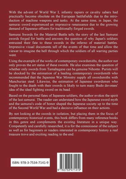 With the advent of World War I, infantry rapiers or cavalry sabers had practically become obsolete on the European battlefields due to the introduction of machine weapons and tanks. At the same time, in Japan, the samurai sword experienced an impressive renaissance due to the growing demand of Japanese officers for traditionally forged swords.Samurai Swords for the Material Battle tells the story of the last Samurai Swords forged for battle and answers the question of why Japan's soldiers entrusted their fate to these swords in the inferno of material battles. Impressive visual documents tell of the events of that time and allow the viewer to imagine the hell through which the soldiers of all warring parties went.Using the example of the works of contemporary swordsmiths, the author not only proves the art status of these swords. He also examines the question of whether only swords from Tamahagane can be genuine Nihonto. Purists will be shocked by the estimation of a leading contemporary swordsmith who recommended that the Japanese War Ministry supply all swordsmiths with Manchurian steel. Likewise, the estimation of Japanese swordsmen who fought to the death with their swords is likely to turn many Budo devotees' idea of the ideal fighting sword on its head.Based on the personal fates of Japanese soldiers, the author evokes the spirit of the last samurai. The reader can understand how the Japanese sword myth and the samurai's code of honor shaped the Japanese society up to the time of the Second World War and had a decisive influence on their actions.By not looking at the swords in isolation, but placing them in the focus of contemporary historical events, this book differs from many reference books in this genre and complements the existing literature in a unique way. Competently and carefully researched, it is for the connoisseur of the subject as well as for beginners or readers interested in contemporary history a real treasure trove and exciting reading to the end.