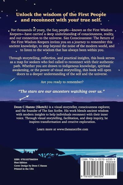 Unlock the wisdom of the First People and reconnect with your true self. For thousands of years, the San people-known as the First Wisdom Keepers-have carried a deep understanding of consciousness, reality, and our connection to the universe. San Consciousness: The Return of the First Wisdom Keepers invites you on a journey to remember this ancient knowledge, to step beyond the noise of the modern world, and to listen to the wisdom that has always been within you. Through storytelling, reflection, and practical insights, this book offers a map for seekers who feel called to reconnect with their authentic path. Whether you're drawn to indigenous knowledge, spiritual awakening, deep inquiry, or the power of visual storytelling, this book opens doors to a deeper understanding of the self and the universe. This work blends ancient teachings with modern insights, offering a transformative and visually engaging experience that speaks to the soul. Are you ready to remember? "The stars are our ancestors watching over us."