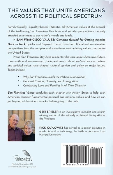 The Values That Unite Americans Across The Political Spectrum Family-friendly. Equality-based. Patriotic. All-American values at the bedrock of the trailblazing San Francisco Bay Area, and yet also perspectives routinely attacked as a threat to our nation's morals and ideals. In SAN FRANCISCO VALUES: Common Ground for Getting America Back on Track, Spieler and Kaplowitz delve, from both liberal and conservative perspectives, into the complex and sometimes contradictory values that define the United States. Proud San Francisco Bay Area residents who care about America's future, the coauthors draw on research, facts, and laws to show how San Francisco values and political voices have shaped national opinion and policy on major issues. Topics include: => Why San Francisco Leads the Nation in Innovation => Personal Choices, Diversity, and Immigration => Celebrating Love and Families in All Their DiversitySan Francisco Values concludes each chapter with Action Steps to help each American consider fundamental personal and national values, and how we can get beyond ad-hominem attacks, before going to the polls.