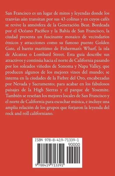 San Francisco es un lugar de mitos y leyendas donde los tranvías aún transitan por sus 43 colinas y en cuyos cafés se revive la atmósfera de la Generación Beat. Bordeada por el Océano Pacífico y la Bahía de San Francisco, la ciudad presenta un fascinante mosaico de vecindarios étnicos y atracciones como su famoso puente Golden Gate, el barrio marítimo de Fisherman's Wharf, la isla de Alcatraz o Lombard Street. Esta guía describe sus atractivos y continúa hacia el norte de California pasando por los soleados viñedos de Sonoma y Napa Valley, que producen algunos de los mejores vinos del mundo; se interna en la ciudades de la Fiebre del Oro, encabezadas por Nevada y Sacramento; para acabar en los fabulosos paisajes de la High Sierras y el parque de Yosemite. También se reseñan los mejores locales de San Francisco y el norte de California para escuchar música, e incluye una amplia relación de los grupos que forjaron la leyenda del rock and roll californiano.
