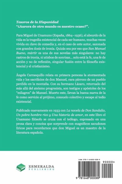 Tesoros de la Hispanidad "¿Aurora de otro mundo es nuestro ocaso?". Para Miguel de Unamuno (España, 1864-1936), el absurdo de la vida es la tragedia existencial de cada ser humano, muchas veces vivida en clave de comedia y, en el caso de este autor, sazonada con grandes dosis de ironía. Quizás sea por eso que San Manuel Bueno, mártir es una de sus novelas más singulares: no hay rastros de ironía, ni atisbos de sonrisas... solo está la fe, una fe de acción y no de reflexión, singular fusión entre la filosofía existencial y el cristianismo. Ángela Carrasquillo relata en primera persona la atormentada vida y los sacrificios de don Manuel, cura párroco de un pueblo perdido en la montaña. Con su hermano Lázaro, retornado del más allá del ateísmo progresista, son testigos y apóstoles de los "milagros" de Manuel. Muerto este, llevan la buena nueva de la fe como servicio al prójimo, consuelo colectivo y escape al tedio existencial. Publicado nuevamente en 1933 con La novela de Don Sandalio, Un pobre hombre rico y Una historia de amor, en este libro el Unamuno filósofo se cruza con el teólogo, expresado en una prosa clara y concisa que sorprende con magníficos sacudones líricos para recordarnos que don Miguel es un maestro de la literatura española. Heir of Søren Kierkegaard and a precursor of continental existentialism, Miguel de Unamuno (Spain, 1864-1936) is one of the main European philosophers of the 20th century, and an outstanding Generation of '98 author. An existential angst, a secret doubt... what tortures "Saint" Manuel Bueno, the good town priest? Only apparent to Angela and her bother Lazarus, a former progressive who is born again into Christianity, Manuel's personal struggle summarizes everyone's horror when faced with the crude reality of existence. San Manuel Bueno, mártir (1931), is one of author's most singular books and a Spanish classic. Narrated in the first person using beautiful and concise descriptions, it is a display of Unamuno's prose at its best. This is an ideal title for anyone seeking to perfect their command of the Spanish language.